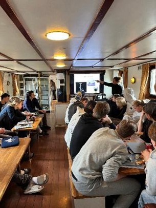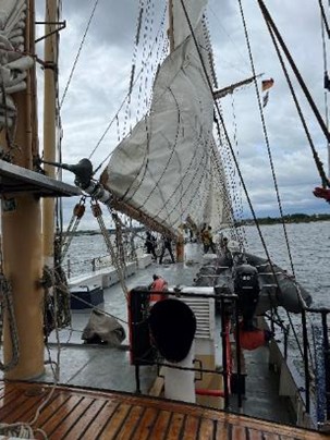 Idag har det gått mer än hälften av tiden. Vi startade dagen med frukost som gjordes av det nya byssanlaget, det består av Roderick, Jack, Victoria, Jonathan, Sebastian, Estelle och Aurora. Efter en god frukost så drog vi i gång med morgonstädningen. Vi andra som inte har byssan blev introducerade till våra nya städområden för de kommande 6-7 dagarna. Efter städningen vid 09:00 tiden så kastade vi loss och lämnade Rendsburg. Fint men väldigt lite puls. Vägen mot Gdansk startade med den sista delen av Kielkanalen. Efter slussningen så möttes vi av friska vindar upp till 14/15 sekundmeter och passade på att hissa segel. Med seglen uppe så blev de flesta på bra humör.